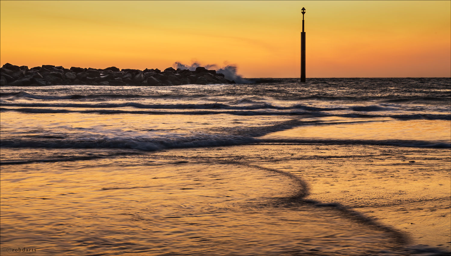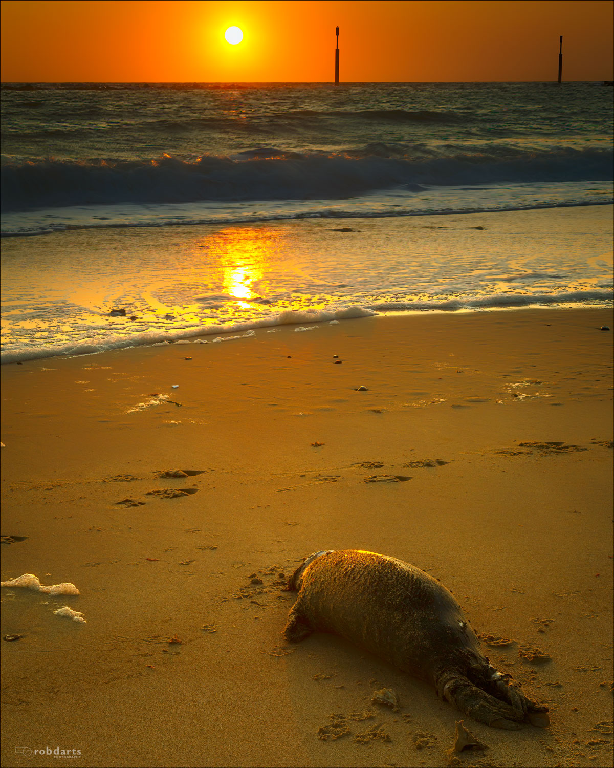 I was amazed just how fast the tide was creeping up the beach towards us and it was inevitable that I would soon have wet feet. My discomfort was soon forgotten as the sun began to cast a golden glow over the scene. However, this was tinged with sadness as nearby we discovered the body of a young seal that had succumbed to the treacherous currents around the sea defences and was lying lifeless (and headless) angled towards the sea.