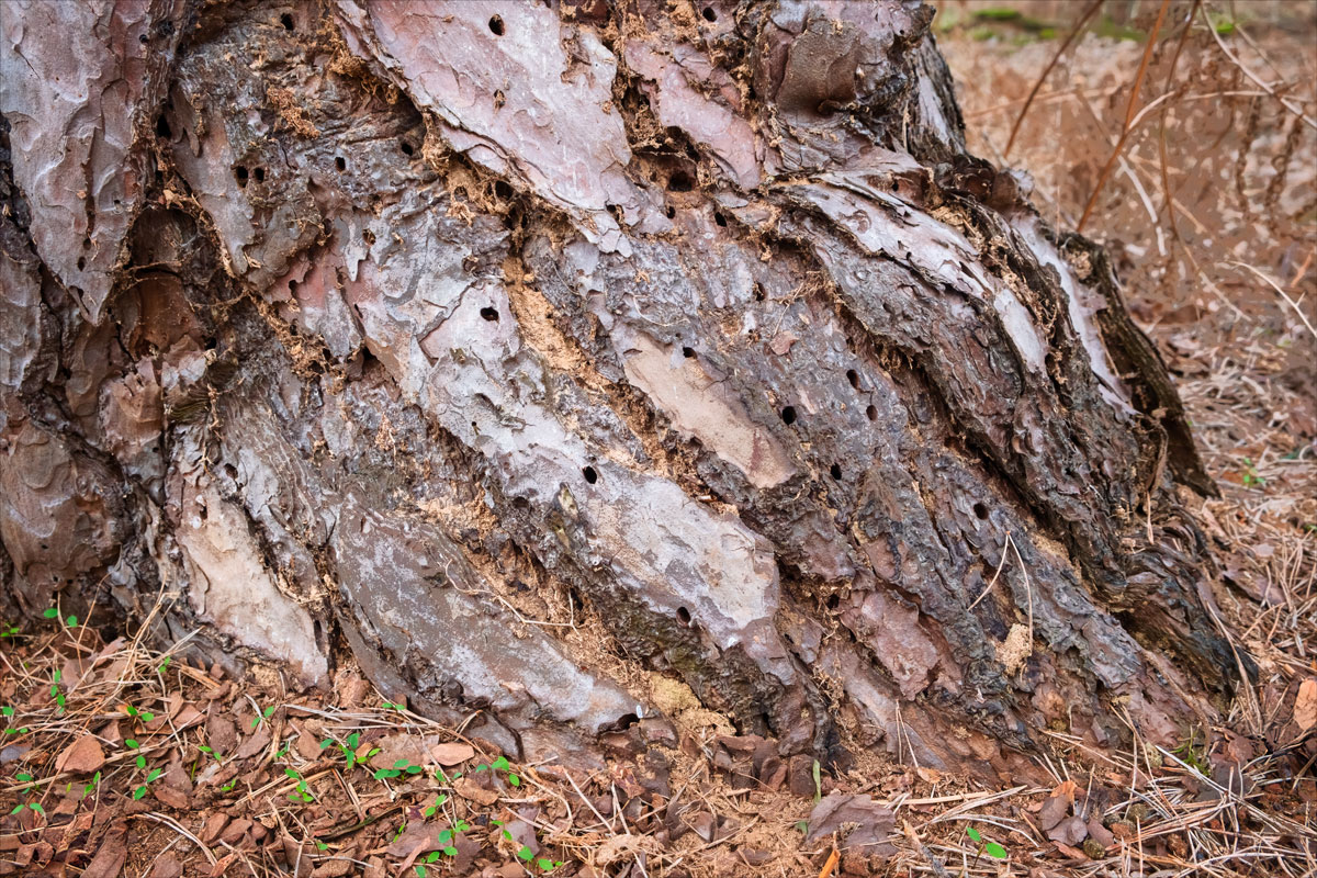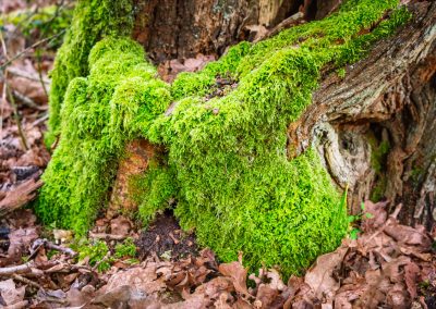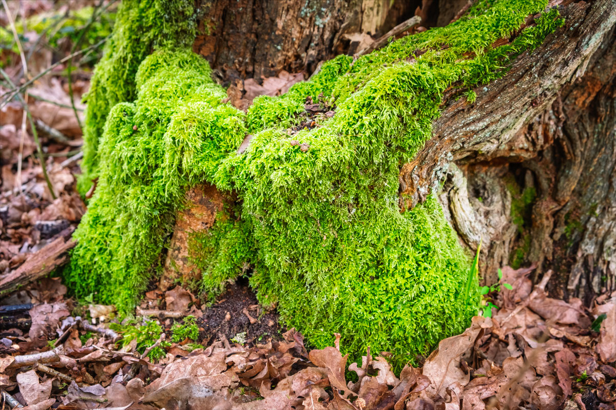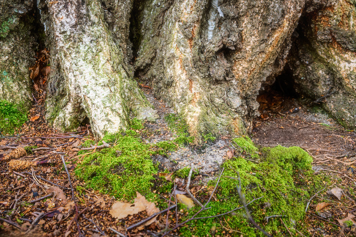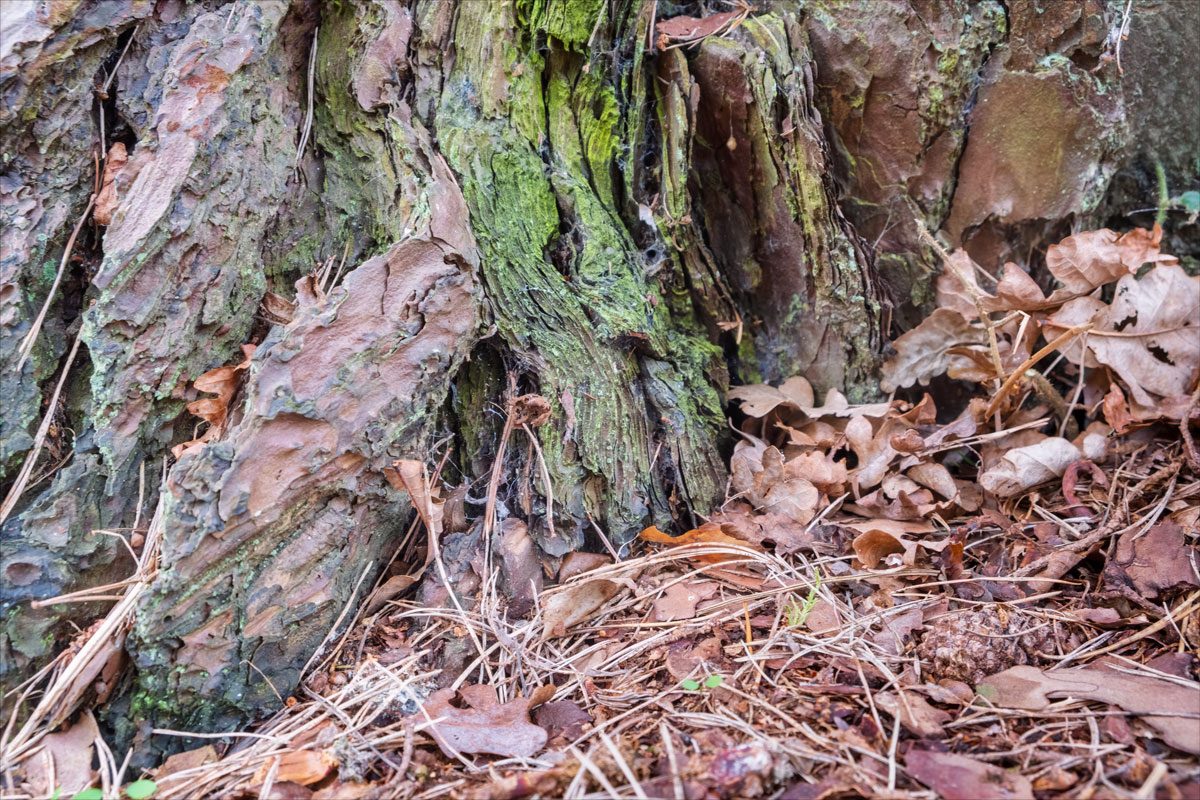 The ground here is a mosaic of tangled roots, softened by fallen leaves and the slow crumble of bark. Moss clings to the rough skin of the trunk’s base, a vibrant green whisper of life. Fungi, like tiny architects of decay, spiral up from the damp earth, weaving themselves into the unseen web of the forest’s breath.
